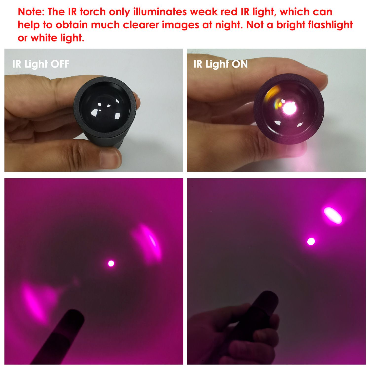 4. The IR torch only emits weak red IR light,which can help to obtain much clearer images At Night. No use during the day. Not a bright flashlight or white light.