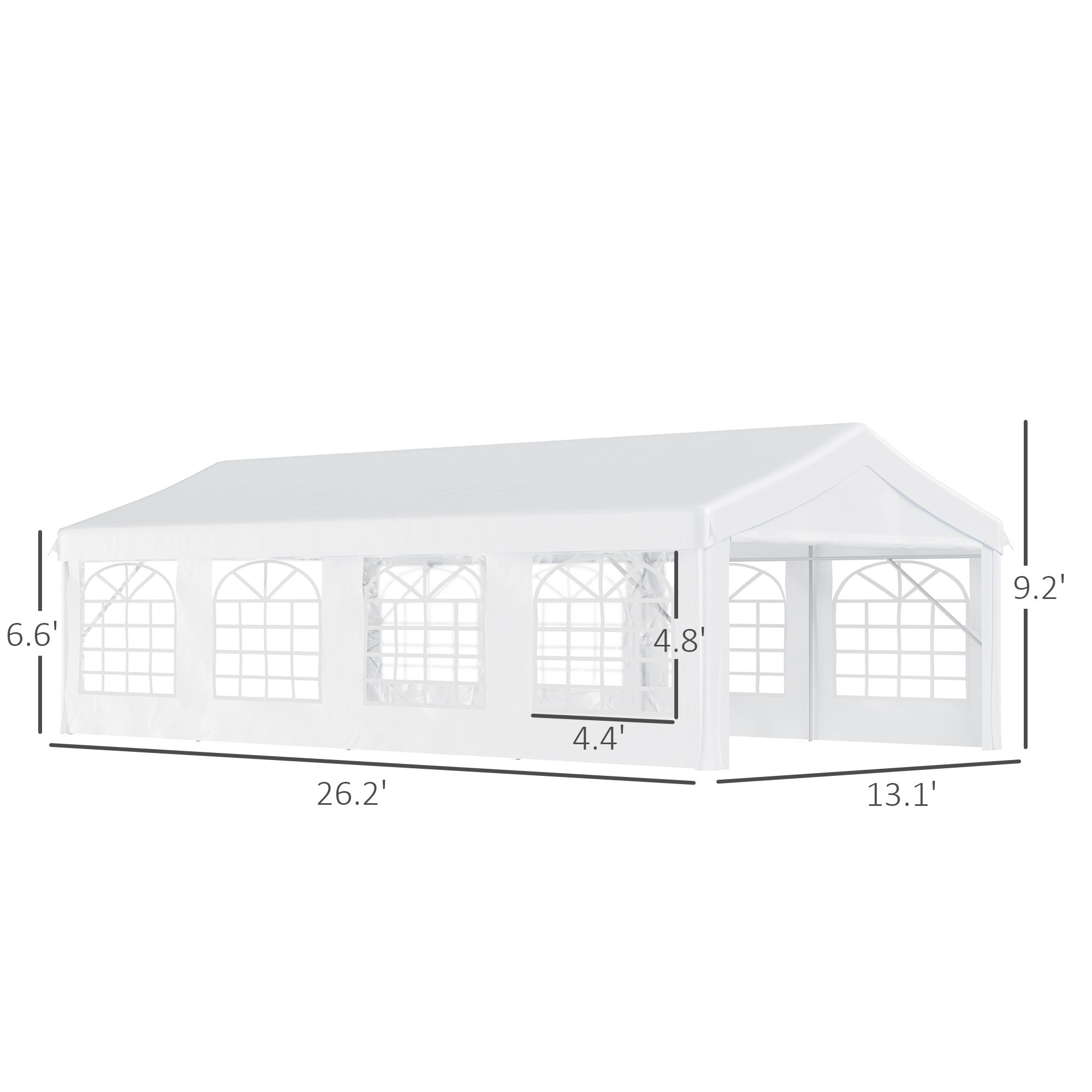 Outsunny's 13' x 26' carport and party tent can protect your project car and transform any outdoor area into a unique event space. Excellent for wedding receptions, graduation parties, or extra-large barbeques, it offers eight stylish cathedral-esque windows. Excellent for small-to-medium cars, boats, furniture, and tools, it stops sun damage and sunburns alike. Made of a galvanized steel frame selected to withstand warping, Outsunny's canopy tent provides portable protection.